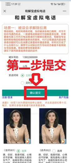 答:下单和解宝电话只需要三个步骤:一是选择你觉得合适的话术,在该话术编号后面点选择,第二步填写被叫的对方号码和归属省份,选择立即发送或者定时发送设好时间,第三步点确定提交,然后会自动跳转到和解宝电话消费记录页面,如果对方接听了电话等三分钟左右即可收听该段录音,洞察对方的反应。